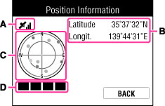 Satellite position and acquiring status of orbital information (C) can be checked on the position information display. Up to 4 indicators which show satellite information-acquiring status are displayed on the positioning indicator (D).
