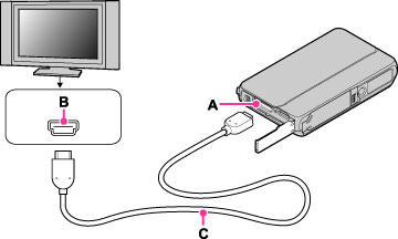 Connect the HDMI connector of the camera (A) and the HDMI jack of the TV (B) using an HDMI Cable (sold separately) (C).